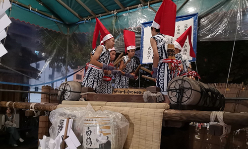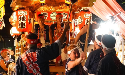 両日ともに迫力満点の地車の曳行、獅子や傘踊りの巡行、催太鼓の奉納が行われます。また社頭では、ハズレなしの開運祈祷福引を行い、多くの参拝者で賑わいます。